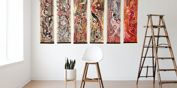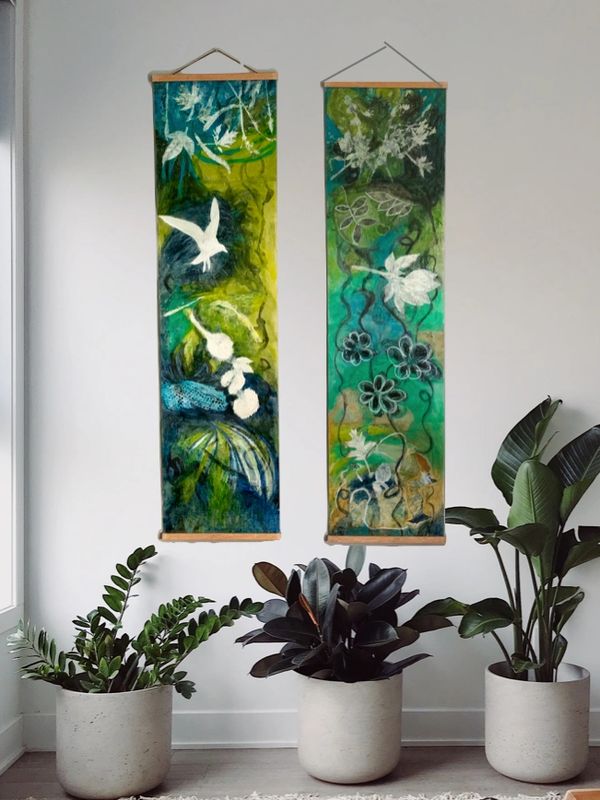 Working larger on Japanese Sumi - e paper scrolls I played with the integration of monotypes into visual film strips that reveal the magic of nature through captivating imprints and impressions, weaving visual stories that resonate with the soul and delve into the beauty of the natural world in a whole new light. In addition to the scrolls the full series consists of works on panels, as well as original matted monotypes.